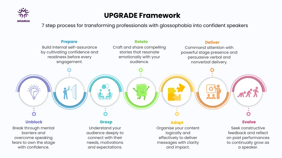 After working with anxious speakers, we developed the UPGRADE methodology. A 7 phase framework that addresses glossophobia systematically: